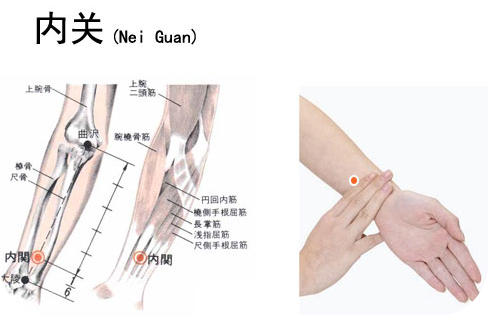 用大拇指按揉內關穴,先揉左手后揉右手,順時針方向按揉一周為一拍,共32拍。(內關穴在腕橫兩橫指,兩筋之間)