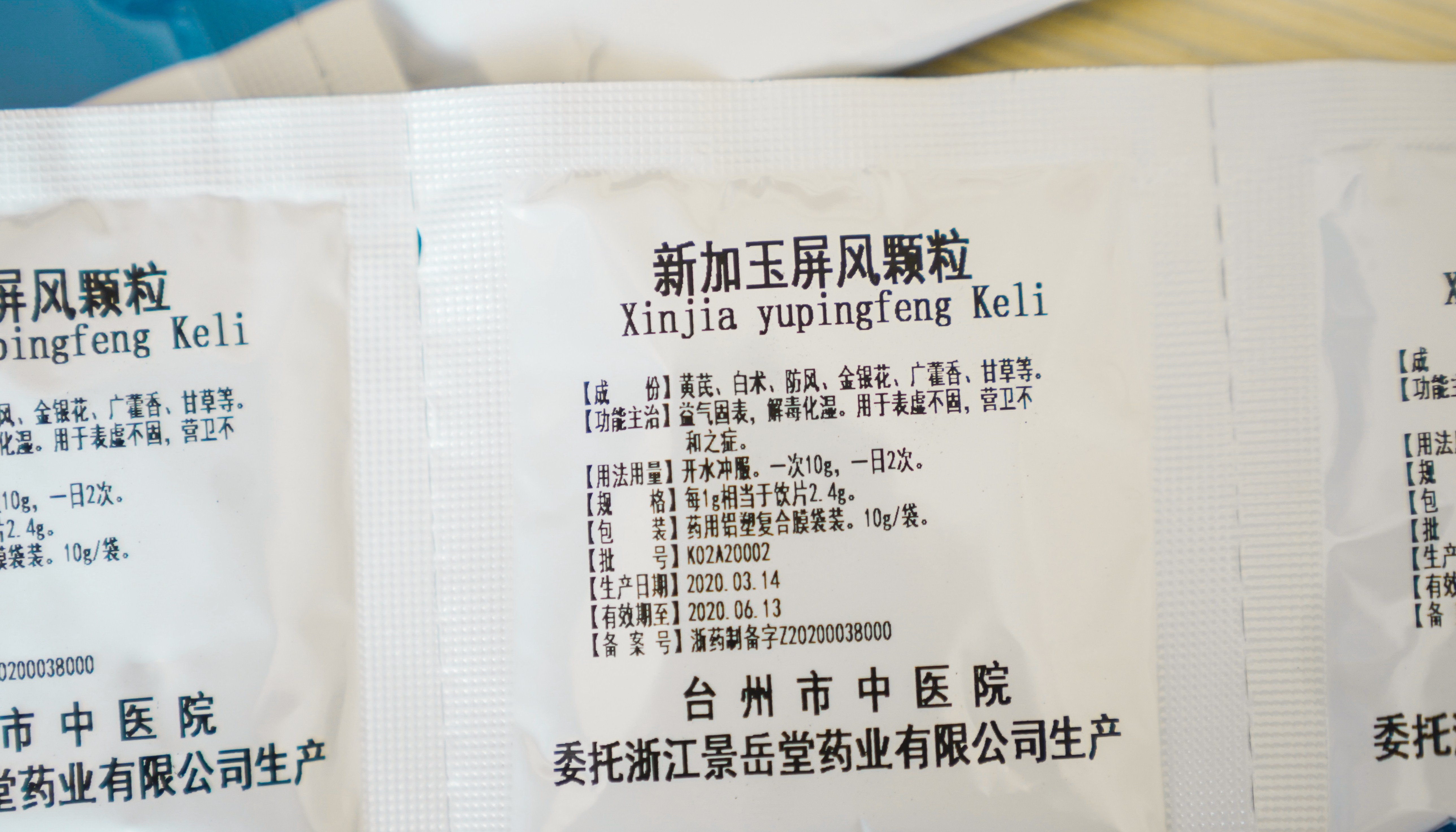 復(fù)學(xué)在即,家長(zhǎng)又期待又怕,怎么辦?根據(jù)省、市疫情防控統(tǒng)一部署,我市各類(lèi)學(xué)校春季開(kāi)學(xué)時(shí)間已定,為更加有效的助力復(fù)學(xué)復(fù)課。臺(tái)州市中醫(yī)院結(jié)合浙江省中醫(yī)藥管理局和浙江省醫(yī)療保障局聯(lián)合發(fā)布的《關(guān)于普通人群使用中藥預(yù)防疫病推薦方的通知》申報(bào)的院內(nèi)制劑疫病預(yù)防方——“新加玉屏風(fēng)顆?!北徽憬∷幤繁O(jiān)督管理局批準(zhǔn)使用。新加玉屏風(fēng)顆粒XinjiayupingfengKeli請(qǐng)仔細(xì)閱讀說(shuō)明書(shū)并在醫(yī)師指導(dǎo)下使用本制劑僅限本醫(yī)療機(jī)構(gòu)使用【成份】黃芪、白術(shù)、防風(fēng)、金銀花、廣藿香、甘草等?!拘誀睢勘酒窞辄S色的顆粒;味澀而后甘?!竟δ苤髦巍恳鏆夤瘫?,解毒化濕。用于表虛不固,營(yíng)衛(wèi)不和之癥。【用法用量】開(kāi)水沖服。一次10g,一日2次。【注意事項(xiàng)】妊娠婦女慎用,兒童用藥酌情減量,或遵醫(yī)囑?!疽?guī)格】每1g相當(dāng)于飲片2.4g?!景b】聚酯/鋁/聚乙烯藥用復(fù)合膜。10g/袋×14袋/中袋。【貯藏】密封?!旧a(chǎn)日期】【產(chǎn)品批號(hào)】【有效期】暫定3個(gè)月【備案號(hào)】浙藥制備字Z20200038000【配制單位】臺(tái)州市中醫(yī)院此方適用于普通人群、年老體弱者;總體功效是益衛(wèi)固表,解毒化濕。其中:1.黃芪甘溫,內(nèi)補(bǔ)脾肺之氣,外可固表益衛(wèi)為君藥;2.白術(shù)健脾益氣,助黃芪以加強(qiáng)益氣固表之功;3.防風(fēng)走表而散風(fēng)邪,勝濕止瀉,合黃芪以益氣祛邪,提升正氣以抵御外邪;4.金銀花辛涼質(zhì)輕,清熱解毒,疏散風(fēng)熱;5.藿香芳香化濕,和中止嘔,行氣辟穢;6.甘草以清熱解毒而利咽喉,又調(diào)和諸藥。詳情可用微信掃二維碼咨詢了解